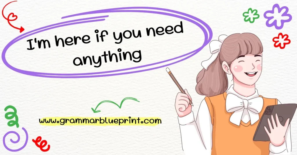 The phrase “I’m here if you need anything” is a friendly and empathetic way to let someone know that you’re available to help, whether they need emotional support or practical assistance. It conveys a sense of care and a willingness to be there for the person in any way they need.
